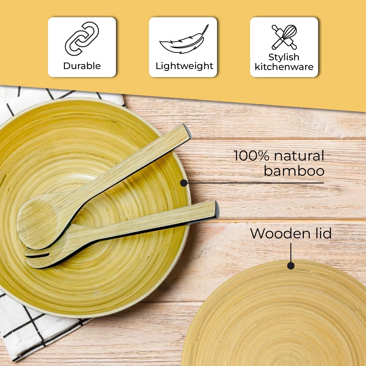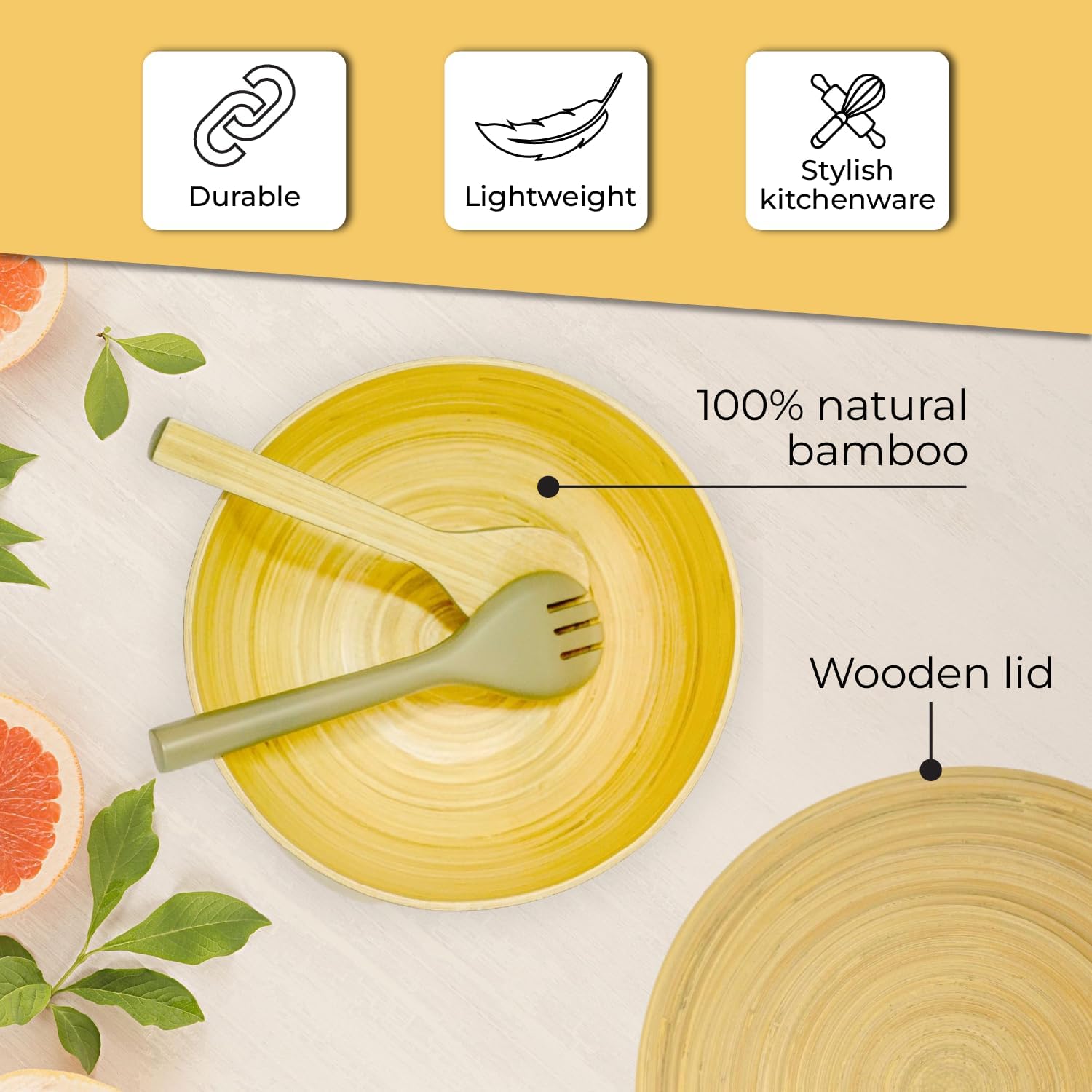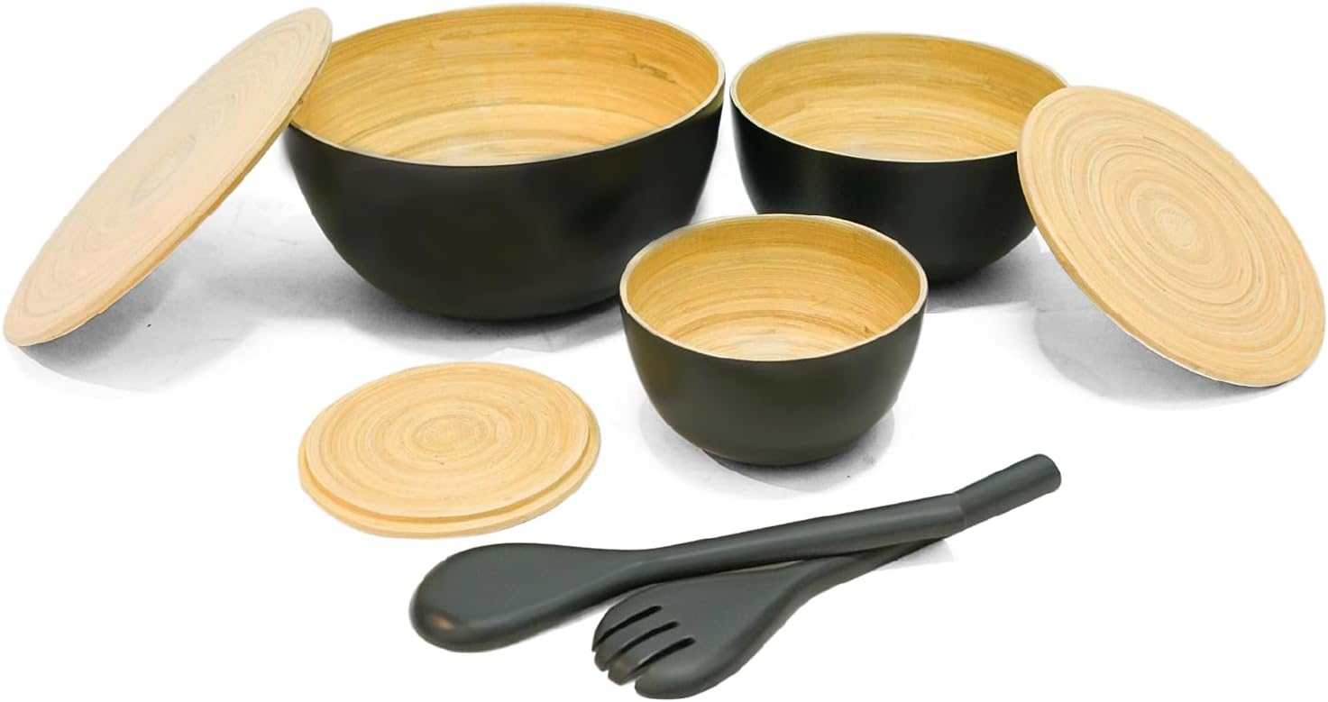 Set of 3 Bamboo Serving Bowl with Wooden Lid, Spoon & Forks in Set – Different Size Storage Set, Mixing Bowl for Serving Salads, Fruits with Utensils Set for Kitchen