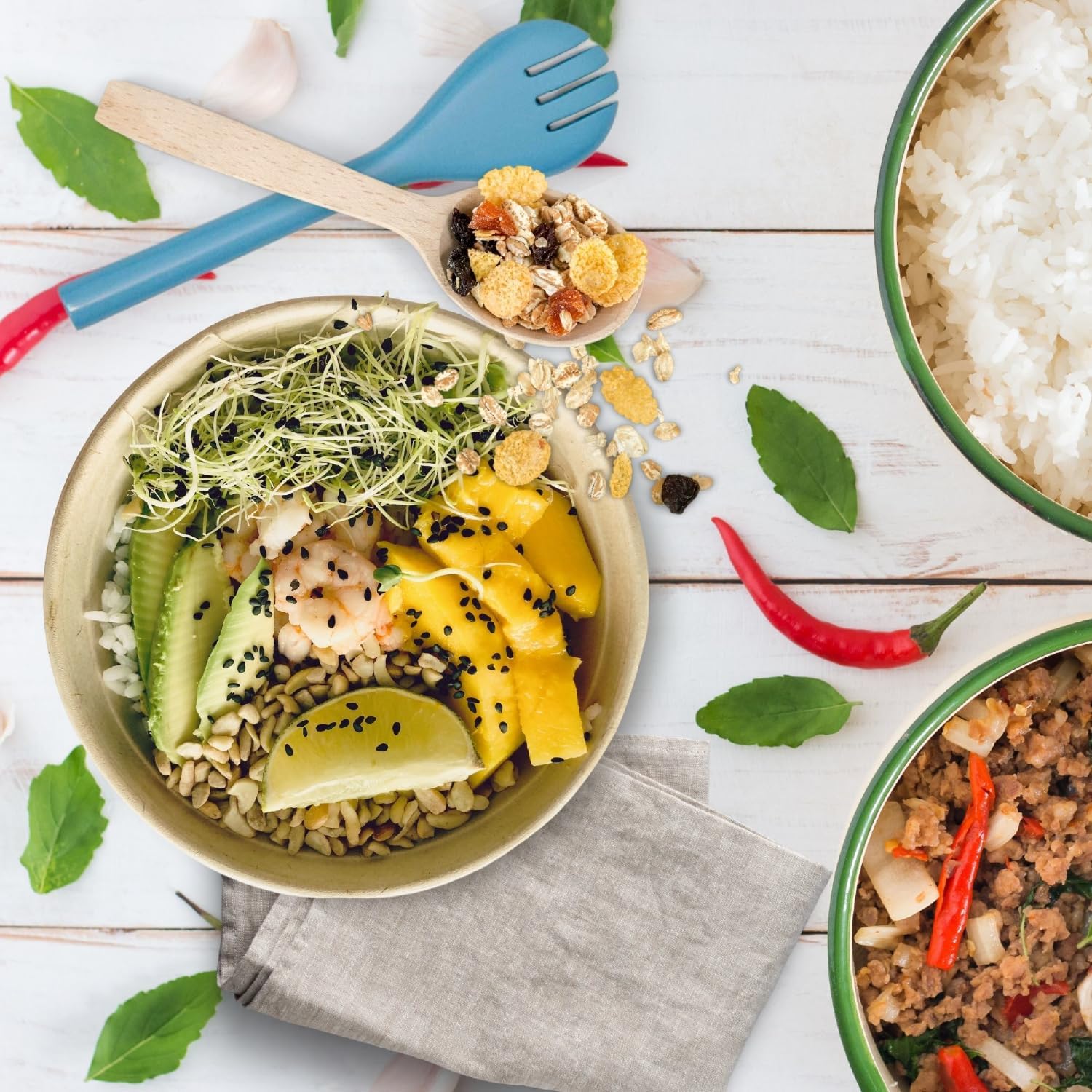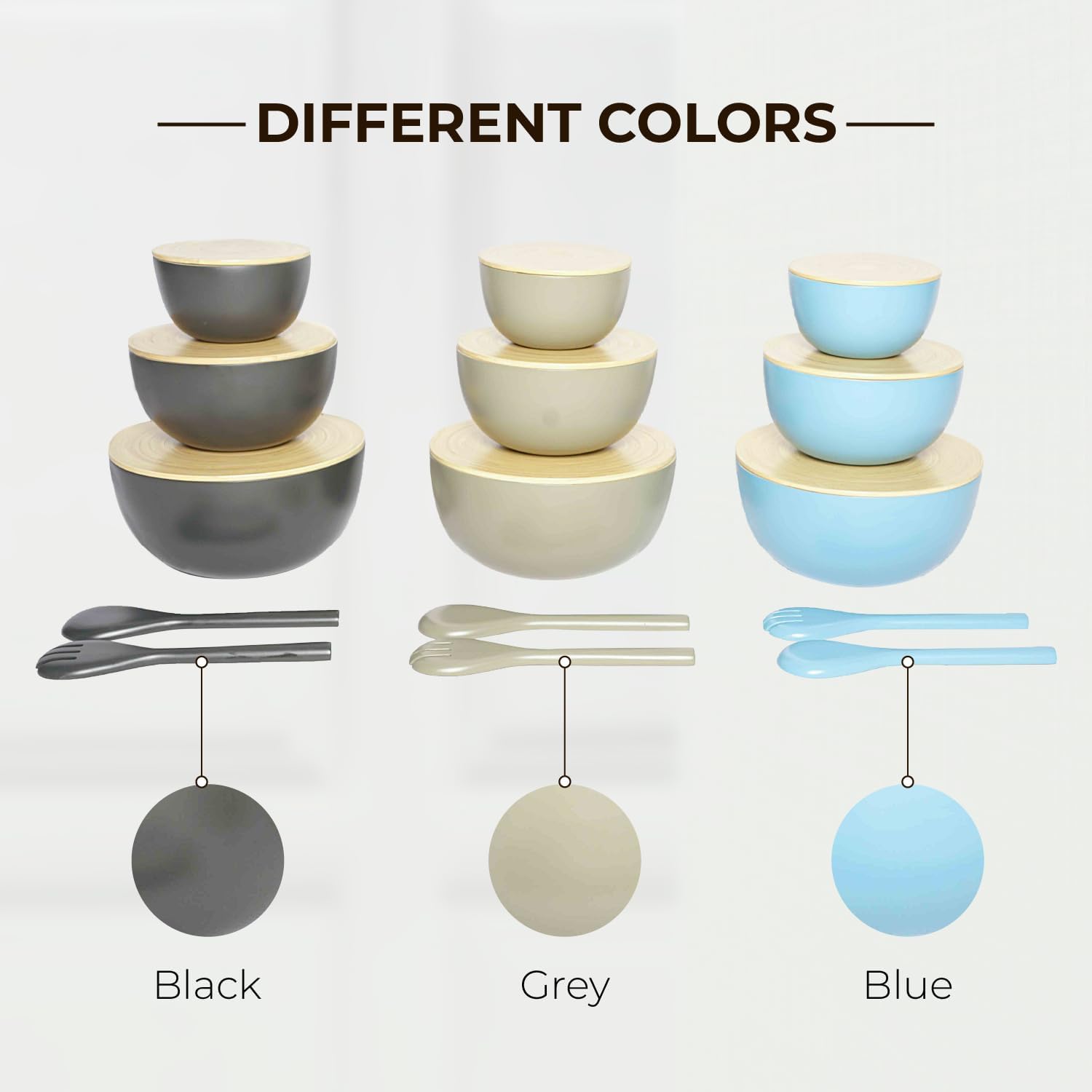 🌈 [Colorful and Multifunctional] Available in three chic colors—Black, Blue, and Grey—our bowls are tailored to suit any decor and come in various sizes, complete with spoons and forks. The wooden lids not only keep your food fresh but also double as handy cutting boards for meal prep.