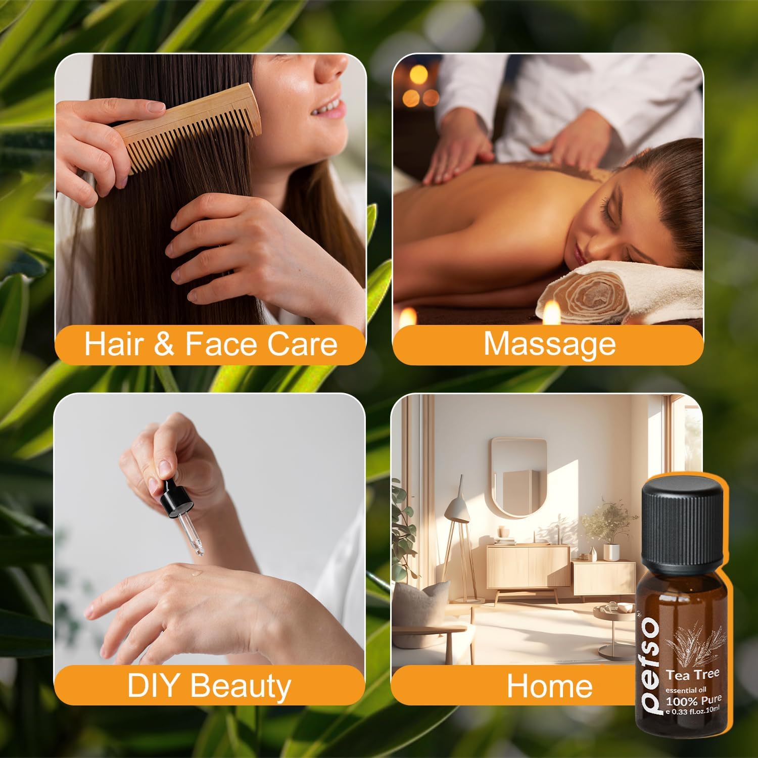 - 🌿[𝐌𝐮𝐥𝐭𝐢𝐩𝐥𝐞 𝐔𝐬𝐞𝐬] Use pure Tea Tree essential oil for face, aromatherapy, massage, or in DIY beauty recipes ( incorporate tea tree oil into your skincare and hair care routines), maintain a clean home. It’s a versatile addition to your essential oil collection.